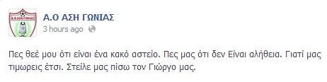 Θρηνεί το Ρέθυμνο και οι συμπαίκτες του 25χρονου στην ομάδα Α.Ο. Ασή Γωνιάς. Σε ανάρτηση στη σελίδα της ομάδας στο Facebook μάλιστα οι συμπαίκτες του άτυχου Γιώργου γράφουν: «Πες Θεέ μου ότι είναι ένα κακό αστείο. Πες μας ότι δεν είναι αλήθεια. Γιατί μας τιμωρείς έτσι. Στείλε μας πίσω τον Γιώργο μας».
