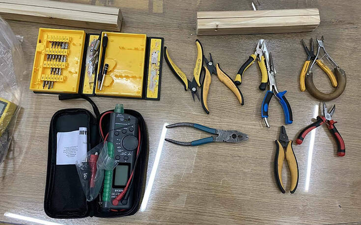 - διάφορα εργαλεία (λίμα, σφυρί, κάβουρας, 2 καλέμια, 6 κατσαβίδια, μύτες κατσαβιδιών, μέτρο, 2 μπουλόνια, μύτη από τρυπάνι, 9 τσιμπίδες, πένσα, πολύγωνο κλειδί, μυστρί, 7 σπάτουλες, μηχάνημα συγκόλλησης και μεταλλικές σφήνες)