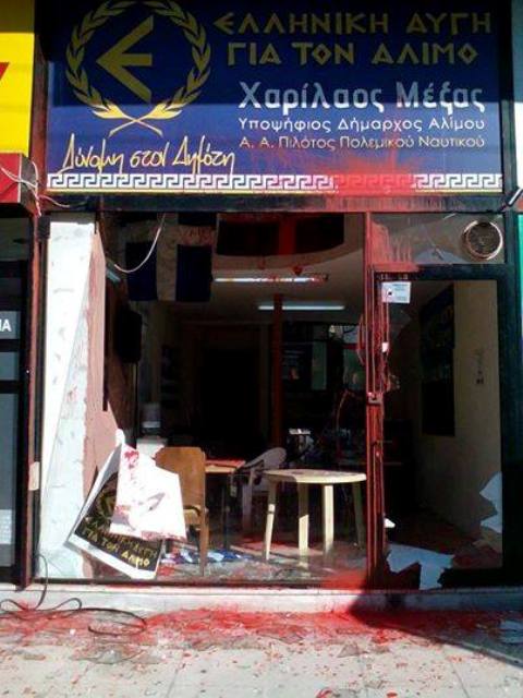Ζημιές σε εκλογικό κέντρο της Ελληνικής Αυγής στον Άλιμο προκάλεσαν άγνωστοι. Συγκεκριμένα, στο στόχαστρο μπήκε το εκλογικό κέντρο του υποψηφίου δημάρχου Αλίμου, Χαρίλαου Μέξα.