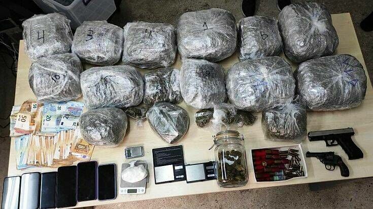 Από τις έρευνες που πραγματοποιήθηκαν, με τη συνδρομή αστυνομικών Ομάδων Πρόληψης και Καταστολής Εγκληματικότητας, στις οικίες των μελών του κυκλώματος βρέθηκαν και κατασχέθηκαν συνολικά: Περισσότερα από 10 κιλά κάνναβη, 172 γραμμάρια κοκαΐνης, 7 ζυγαριές ακριβείας, περίστροφο και πιστόλι κρότου, 39.060 ευρώ, 5 οχήματα, 6 μοτοσικλέτες και 36 κινητά τηλέφωνα.