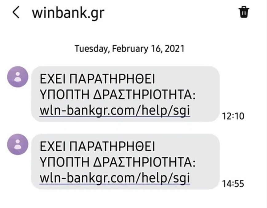 Στις 16 Φεβρουαρίου η ελεύθερη επαγγελματίας έλαβε ένα μήνυμα στο κινητό τηλέφωνο της από τον φερόμενο ως WINBANK.GR αποστολέα που ανέφερε αυτολεξεί τα εξής: ΕΧΕΙ ΠΑΡΑΤΗΡΗΘΕΙ ΥΠΟΠΤΗ ΔΡΑΣΤΗΡΙΟΤΗΤΑ: win-bankgr.com/help/sgi.