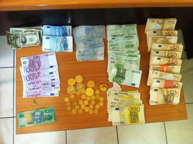 – Τα χρηματικά ποσά των 74.620 ευρώ, των 250 δολαρίων Αυστραλίας, των 140 δολαρίων ΗΠΑ, 25 χρυσές λίρες Αγγλίας, 4 χρυσά νομίσματα ΗΠΑ, 3 χρυσά νομίσματα Αγγλίας και 2 χρυσά νομίσματα Μεξικού.