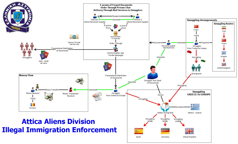 - ο 30χρονος αναλάμβανε τη μεταφορά των νεοεισερχόμενων μεταναστών από την Βόρεια Ελλάδα προς την Αθήνα και κατόπιν την απόκρυψη τους στο «Safe House» στην Κυψέλη. Επίσης, συμμετείχε στον εφοδιασμό των μεταναστών με πλαστά ταξιδιωτικά έγγραφα και τη μεταφορά τους στο Διεθνή Αερολιμένα Αθηνών, προκειμένου να ολοκληρωθεί η παράνομη προώθηση σε άλλες ευρωπαϊκές χώρες.