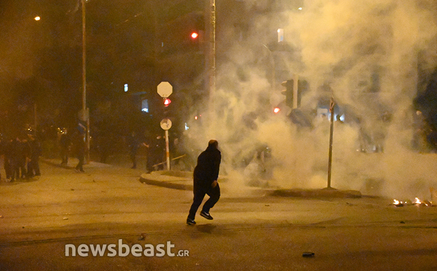 Πλησιάζοντας τον αστυνομικό φραγμό προ του Τμήματος, ομάδα (400) περίπου ατόμων που προηγείτο της πορείας, έχοντας καλυμμένα τα χαρακτηριστικά του προσώπου τους και κρατώντας στα χέρια τους μολότοφ, φωτοβολίδες, καπνογόνα, καδρόνια, μπετόβεργες και άλλα αντικείμενα ανέπτυξε ταχύτητα και επιτέθηκε με σφοδρότητα στις αστυνομικές δυνάμεις.