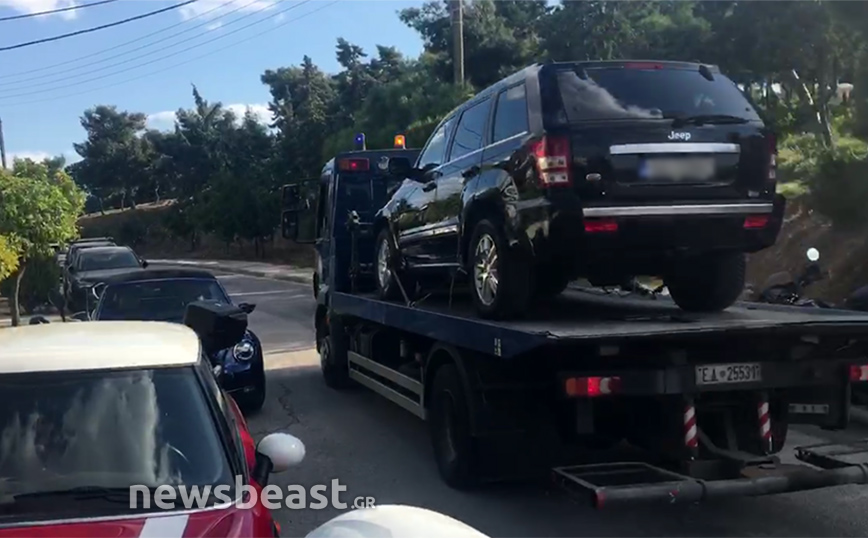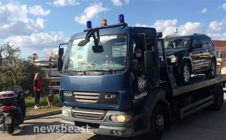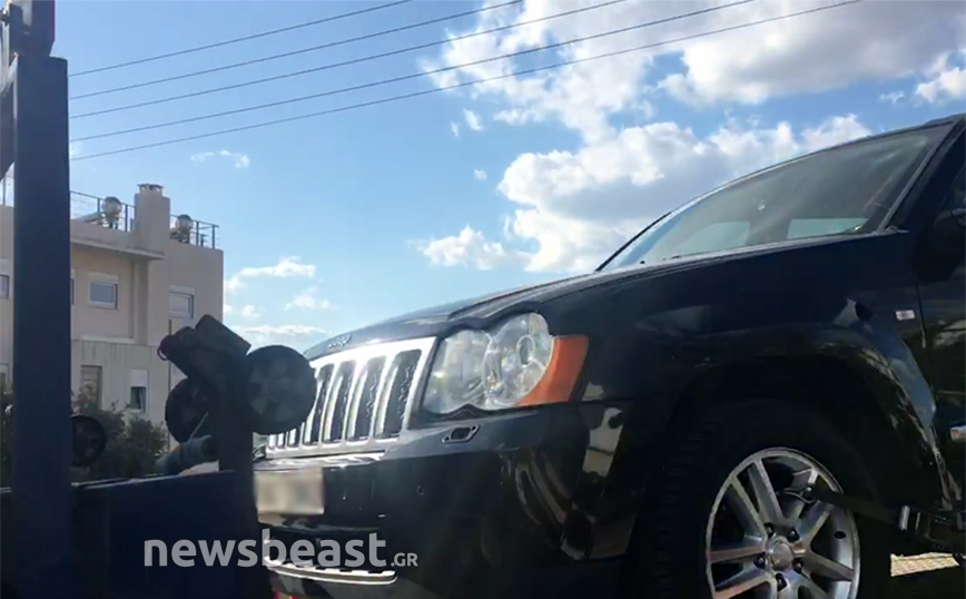 Όπως φαίνεται στο φωτορεπορτάζ του newsbeast.gr, το τζιπ απομακρύνεται από το σημείο της δολοφονίας με γερανό της αστυνομίας, προκειμένου να ερευνηθεί.
