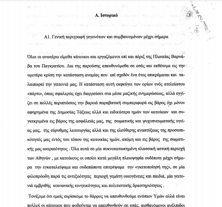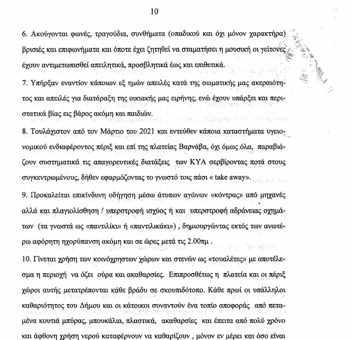 «Η κατάσταση αυτή ξεφεύγει των ορίων ενός ατελείωτου «πάρτι», όπως λανθασμένα έχει διαρρεύσει στα μέσα μαζικής ενημερώσεως, αλλά εγγίζει σε πολλές περιπτώσεις την βαριά παραβατική συμπεριφορά εις βάρος όχι μόνον αφηρημένα της Δημοσίας Τάξεως αλλά και ειδικότερα ημών των κατοίκων και συγκεκριμένα εις βάρος της ασφάλειάς μας, της σωματικής και ψυχοπνευματικής υγείας μας, της εύρυθμης λειτουργίας αλλά και της ελεύθερης αναπτύξεως της προσωπικότητάς μας εντός του τόπου της κατοικίας ημών, ακόμη και εις βάρος της σωματικής μας ακεραιότητας» τονίζουν χαρακτηριστικά οι κάτοικοι στην μηνυτήρια αναφορά τους.