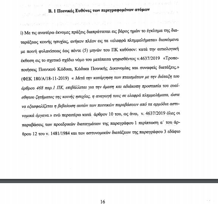 Με την μηνυτήρια αναφορά τους στρέφονται κατά παντός υπευθύνου που διαπράττει όπως αναφέρουν, μεταξύ άλλων, τα αδικήματα της διατάραξης κοινής ησυχίας, της υποβάθμισης του περιβάλλοντος , της παραβίασης των μέτρων κατά του κορονοιού, αλλά παράβασης του νόμων περί όπλων και ναρκωτικών.