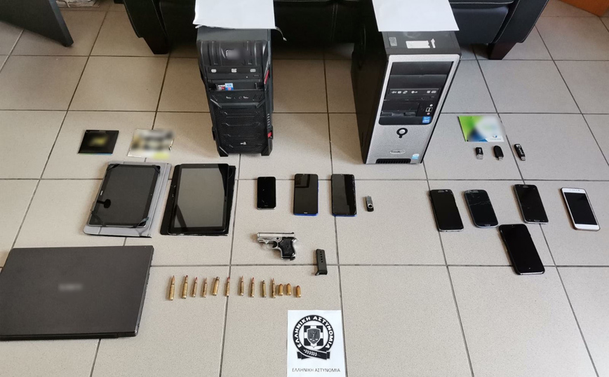 Κατά τη διάρκεια των ερευνών στα σπίτια των συλληφθέντων βρέθηκαν επτά κάρτες κινητής τηλεφωνίας, ηλεκτρονικοί υπολογιστές, οκτώ συσκευές κινητών τηλεφώνων και τέσσερις μονάδες αποθήκευσης. Επιπλέον, στο σπίτι του 23χρονου βρέθηκαν ένα πιστόλι και 13 φυσίγγια διαφόρων τύπων και διαμετρημάτων.