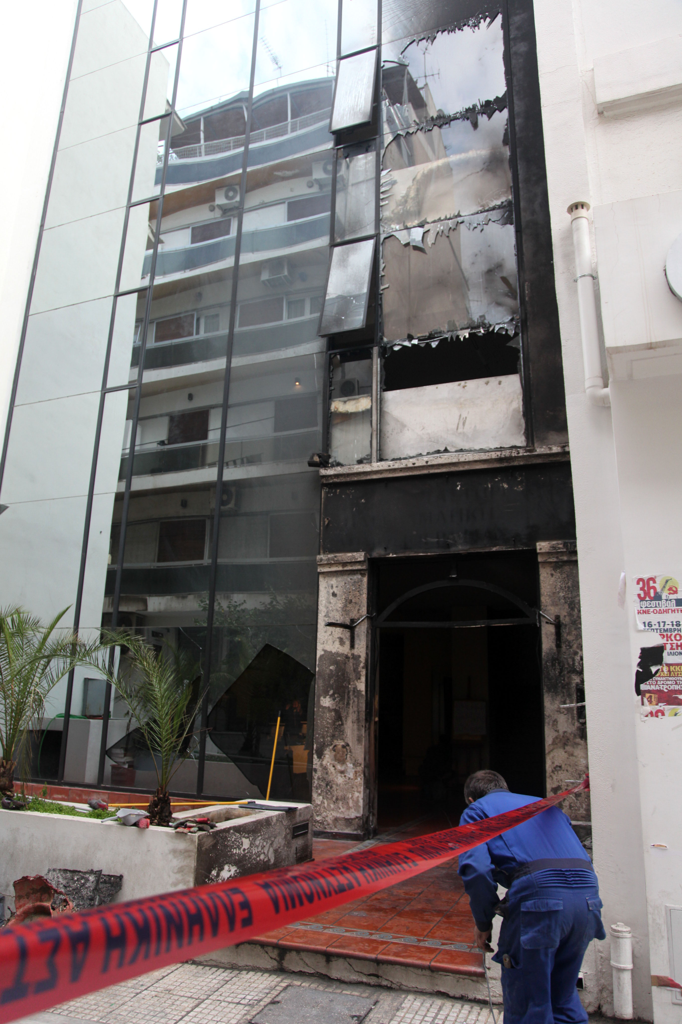 Από την έκρηξη και την πυρκαγιά που ακολούθησε έσπασαν όλα τα τζάμια του πενταόροφου κτιρίου στο ισόγειο, τον πρώτο και το δεύτερο όροφο, ενώ μαύρισαν από τη φωτιά και τους καπνούς οι τοίχοι του ισογείου.