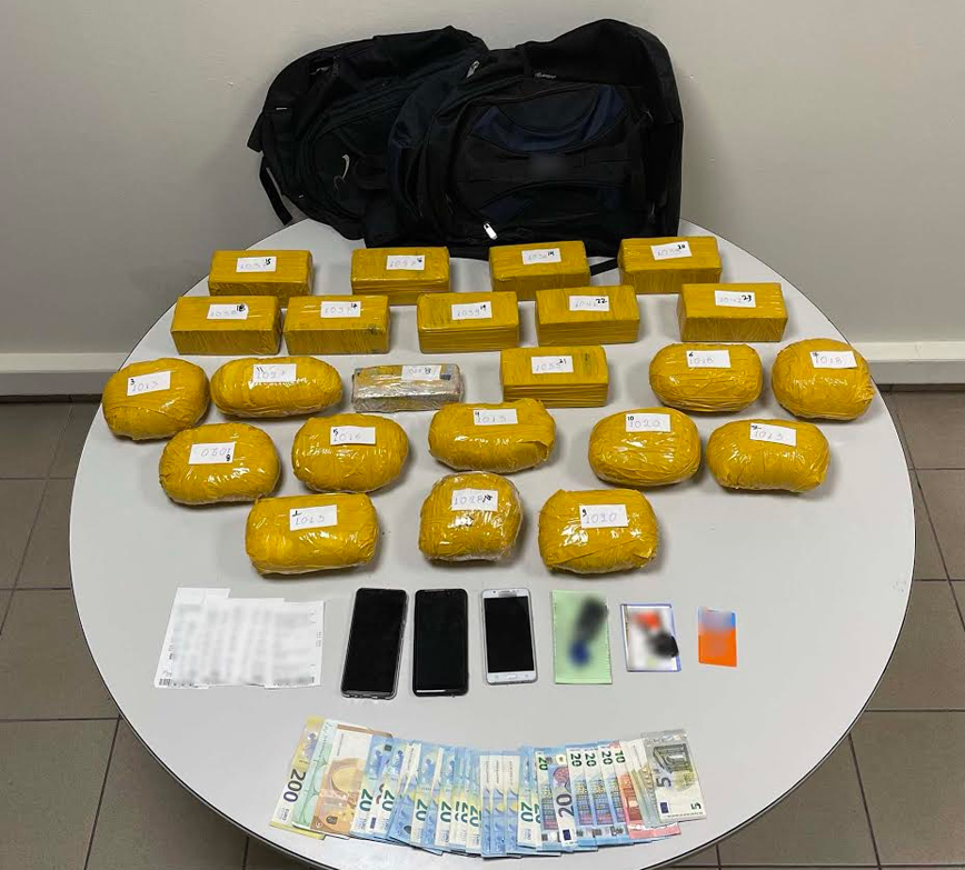 Στα χέρια της Αστυνομίας βρίσκονται δύο αλλοδαποί ηλικίας 50 και 43 ετών, οι οποίοι μέσα στα σακίδιά τους είχαν κρύψει 23 κιλά κοκαΐνης. Οι δύο άνδρες αποτελούν μέλη οργανωμένου διεθνούς κυκλώματος εισαγωγής, κατοχής, μεταφοράς και διακίνησης ναρκωτικών από την Τουρκία.