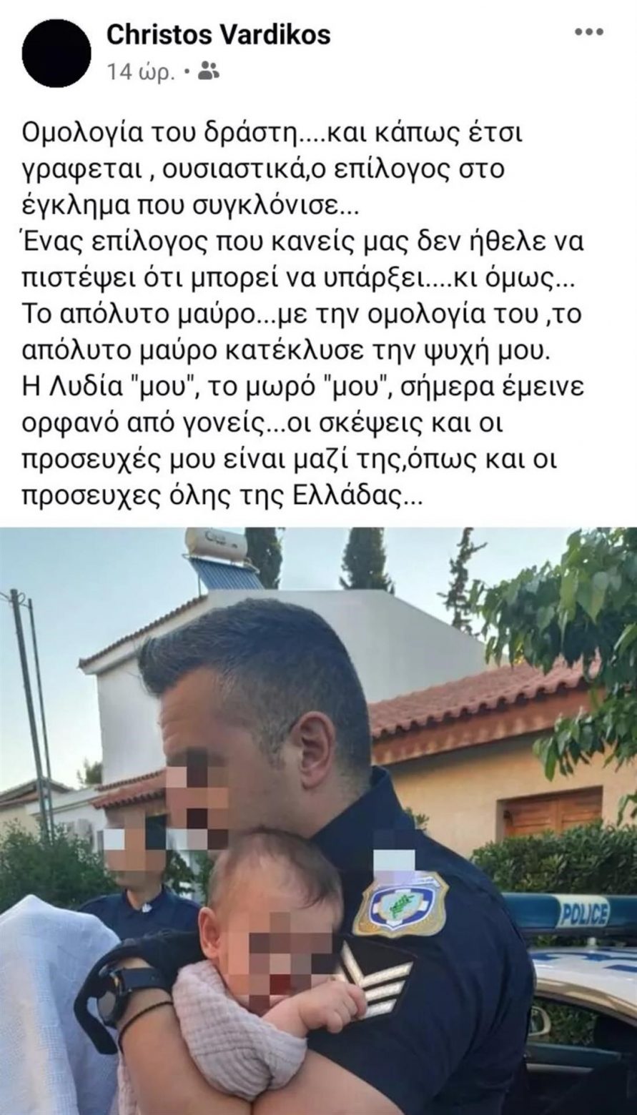 Συγκινεί η ανάρτηση του αστυνομικού που που μπήκε πρώτος στη σκηνή του στυγερού εγκλήματος στα Γλυκά Νερά και πήρε στα χέρια του το μωρό της 20χρονης Καρολάιν.