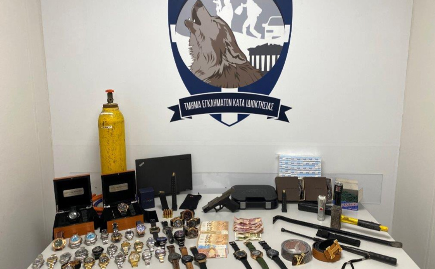 Στην κατοχή τους, καθώς και από τις έρευνες σε οικίες και χώρους, βρέθηκαν και κατασχέθηκαν φιάλη υγραερίου, ηλεκτρικά καλώδια, φυτίλια, πιστόλι, φυσίγγια, λοστοί, βαριοπούλα, μικροποσότητα κάνναβης, πλήθος ρολογιών, κινητά τηλέφωνα και κάρτες SIM .