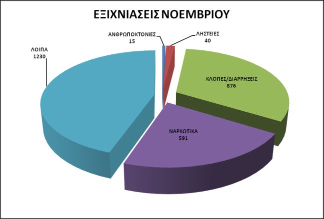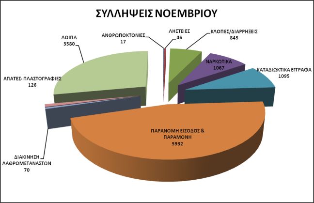 Συνολικά 12.778 άτομα συνελήφθησαν σε όλη την επικράτεια τον Νοέμβριο, έναντι 16.309 τον Οκτώβριο του 2014, όπως προκύπτει από τα συνολικά στοιχεία συλλήψεων, εξιχνιάσεων, εξαρθρώσεων και κατασχέσεων, που δημοσιεύει ανά μήνα η Ελληνική Αστυνομία. Παράλληλα, εξιχνιάστηκαν 2.752 υποθέσεις, έναντι 3.013 τον Οκτώβριο του 2014.