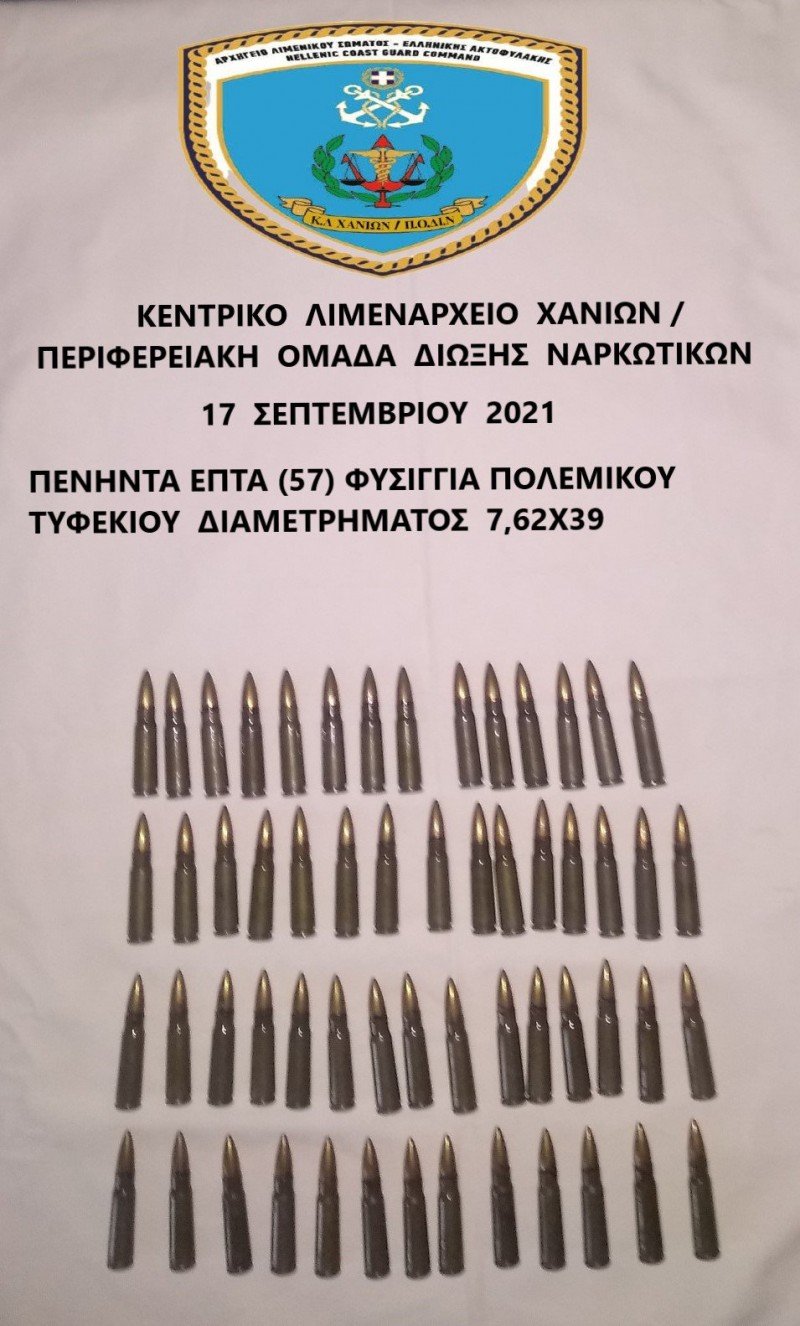 Συγκεκριμένα, κατά τη διάρκεια ελέγχου, που διενεργήθηκε από την Περιφερειακή Ομάδα Δίωξης Ναρκωτικών (Π.Ο.ΔΙ.Ν) της Λιμενικής Αρχή Χανίων, μετά τον κατάπλου Ε/Γ-Ο/Γ πλοίου, κατελήφθη ο ανωτέρω να έχει στην κατοχή του πενήντα επτά (57) φυσίγγια διαμετρήματος 7,62×39 M43.