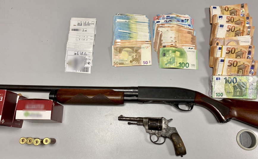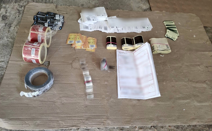 - Ποσότητα 4.638 φιάλες με επικολλημένες ετικέτες επώνυμων εταιριών, 9.889 αυτοκόλλητες ετικέτες, 30 φιάλες διαλύτες, 95 λίτρα τσίπουρο, 15 λίτρα τζιν, 4.638 φιάλες με επικολλημένες ετικέτες επώνυμων εταιριών, 10 λίτρα ούζο, 15 λίτρα μαστίχα, 20 λίτρα τεκίλα, συνολικό χρηματικό ποσό των 39.495 ευρώ και 485 λέβα Βουλγαρίας, 4 αυτοκίνητα, 3 φορτηγά και 1 επιβατικό, 8 συσκευές κινητών τηλεφώνων, περίστροφο, κυνηγετική καραμπίνα, 57 φυσίγγια, 2 ξύστρες και ιδιόχειρες σημειώσεις.