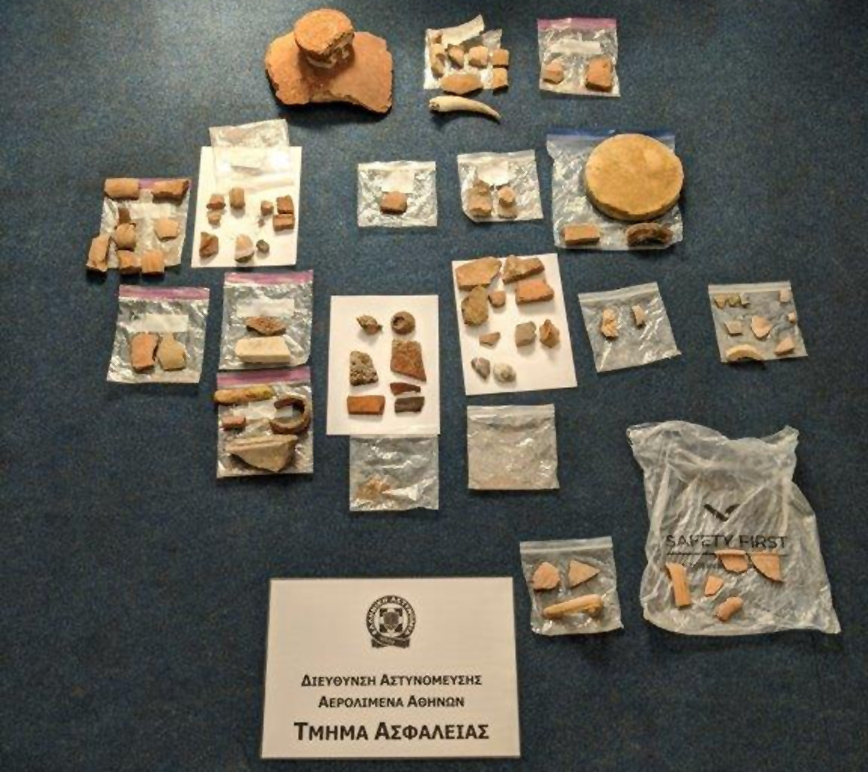 Ειδικότερα, στην αποσκευή του άνδρα βρέθηκαν 14 διάφανα σακουλάκια και μία χάρτινη σακούλα που περιείχαν συνολικά 65 θραύσματα αρχαίων αγγείων και αντικειμένων, ενώ σε αυτή της γυναίκας εντοπίστηκαν δύο διάφανα σακουλάκια που περιείχαν οκτώ θραύσματα αρχαίων αγγείων και αντικειμένων.