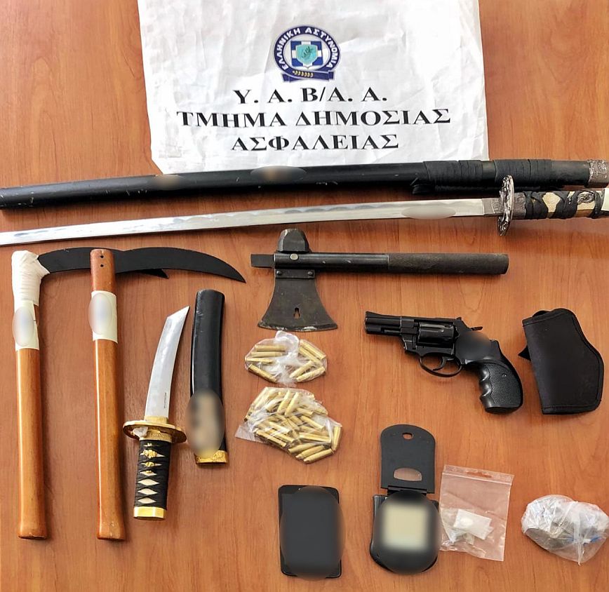 Αρκετά όπλα βρέθηκαν στο σπίτι του 40χρονου, ο οποίος σύμφωνα με πληροφορίες πυροβόλησε τους δύο υπαλλήλους ντυμένος σαμουράι.