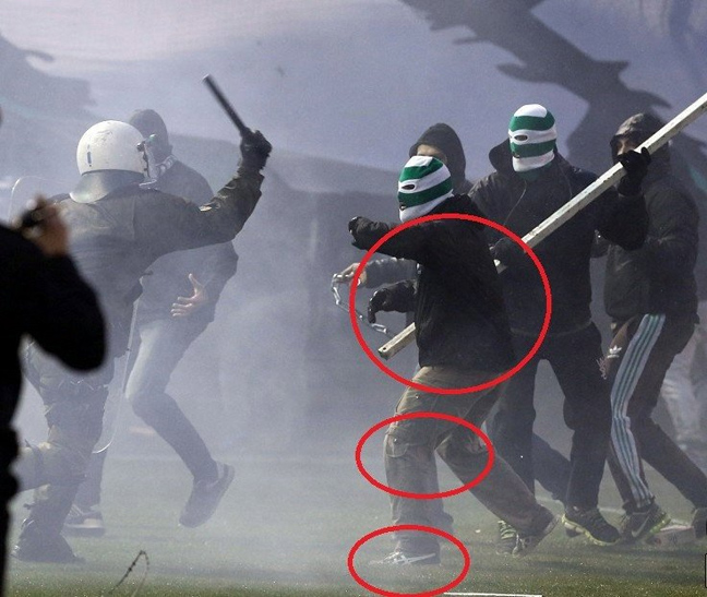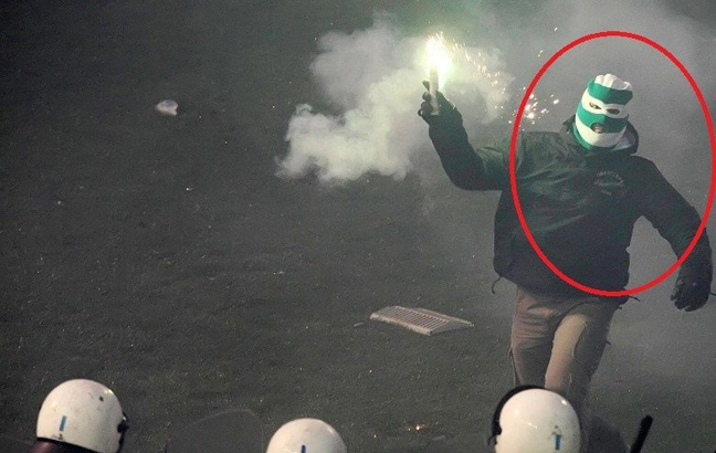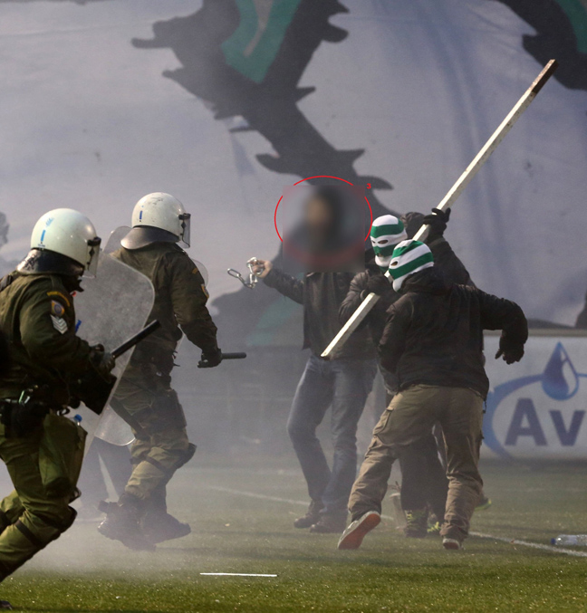 Πρόκειται για έναν 36χρονο Έλληνα, ο οποίος είχε εισέλθει στον αγωνιστικό χώρο πριν την έναρξη του αγώνα κρατώντας στο δεξί του χέρι μεταλλική αλυσίδα και έναν 26χρονο Έλληνα, ο οποίος επίσης είχε εισέλθει στον αγωνιστικό χώρο και είχε καλυμμένα πλήρως τα χαρακτηριστικά του προσώπου του με κουκούλα τύπου full face χρώματος πράσινου λευκού (ριγέ) και κρατούσε στο δεξί του χέρι φωτοβολίδα.