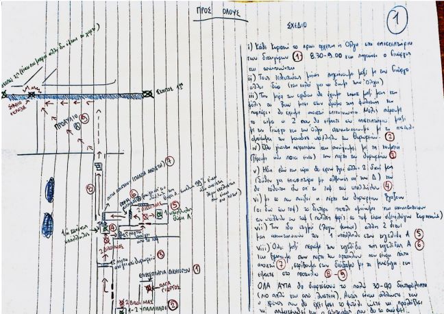 Μετά ανοίγουμε με τα κουμπιά (ξέρουμε ήδη ποια είναι) την πόρτα του θυρωρείου. Με το που ανοίγει, οι δύο άλλοι δικοί μας θα βγάλουν το δεύτερο πιστόλι ομοίωμα για να ακινητοποιήσουν τον δεύτερο υπάλληλο. Με έντονες φωνές άλλοι δύο δικοί μας ακινητοποιούν τον 1 υπάλληλο στην κιγκλίδα Α» περιγράφει αναλυτικά ο έγκλειστος Πυρήνας χρωματίζοντας ανάλογα το σχεδιάγραμμα. Καταλήγει: «ΟΛΑ ΑΥΤΑ θα διαρκέσουν το πολύ 30-40 δευτερόλεπτα (πιο απλό και από ληστεία). Αυτός είναι άλλωστε και ο χρόνος που θα έχει μπει το φιτίλι ώστε να προλάβει να απομακρυνθεί ο σύντροφος που θα το ανάψει».