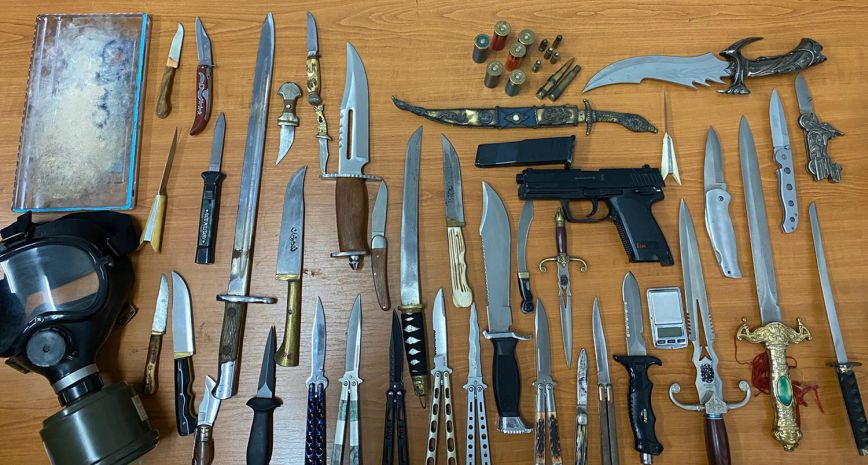 Ωστόσο, η κατ’ οίκον έρευνα έβγαλε «λαβράκι» καθώς στο σπίτι του 36χρονου εντοπίστηκε ένα μίνι οπλοστάσιο, όπως αποτυπώνεται και στη φωτογραφία που έδωσε στη δημοσιότητα η ΕΛ.ΑΣ. Πιο αναλυτικά, βρέθηκαν και κατασχέθηκαν ένα πιστόλι ρέπλικα, 43 μαχαίρια, έξι φυσίγγια πυροβόλου όπλου, ένας κάλυκας πυροβόλου όπλου, έξι φυσίγγια καραμπίνας και αντιασφυξιογόνα μάσκα.