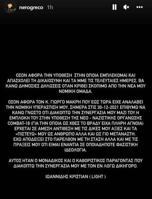 Όσον αφορά τον κ. Γιώργο Μακρή που έως τώρα είχε αναλάβει την νομική υπεράσπισή μου. Σήμερα στις 30-12-2021 επιθυμώ να κάνω γνωστό ότι διακόπτω την συνεργασία μου μαζί του.