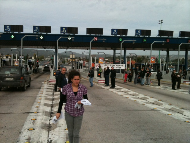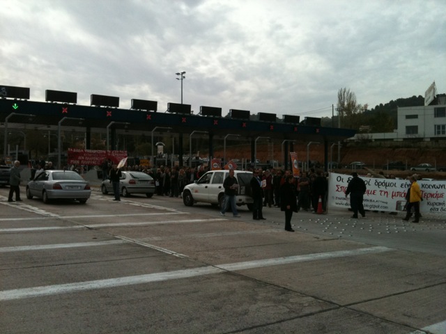 Στα διόδια βρίσκονται 200 περίπου κάτοικοι με πλακάτ και πανό τη στιγμή που οι υπάλληλοι των διοδίων απολαμβάνουν το διάλειμμά με καφέ και… τσιγάρο δίπλα από τα ταμεία. Η αστυνομία δεν επιχειρεί να εμποδίσει την κίνηση των κατοίκων και έχει μια διακριτική παρουσία με 2 περιπολικά.