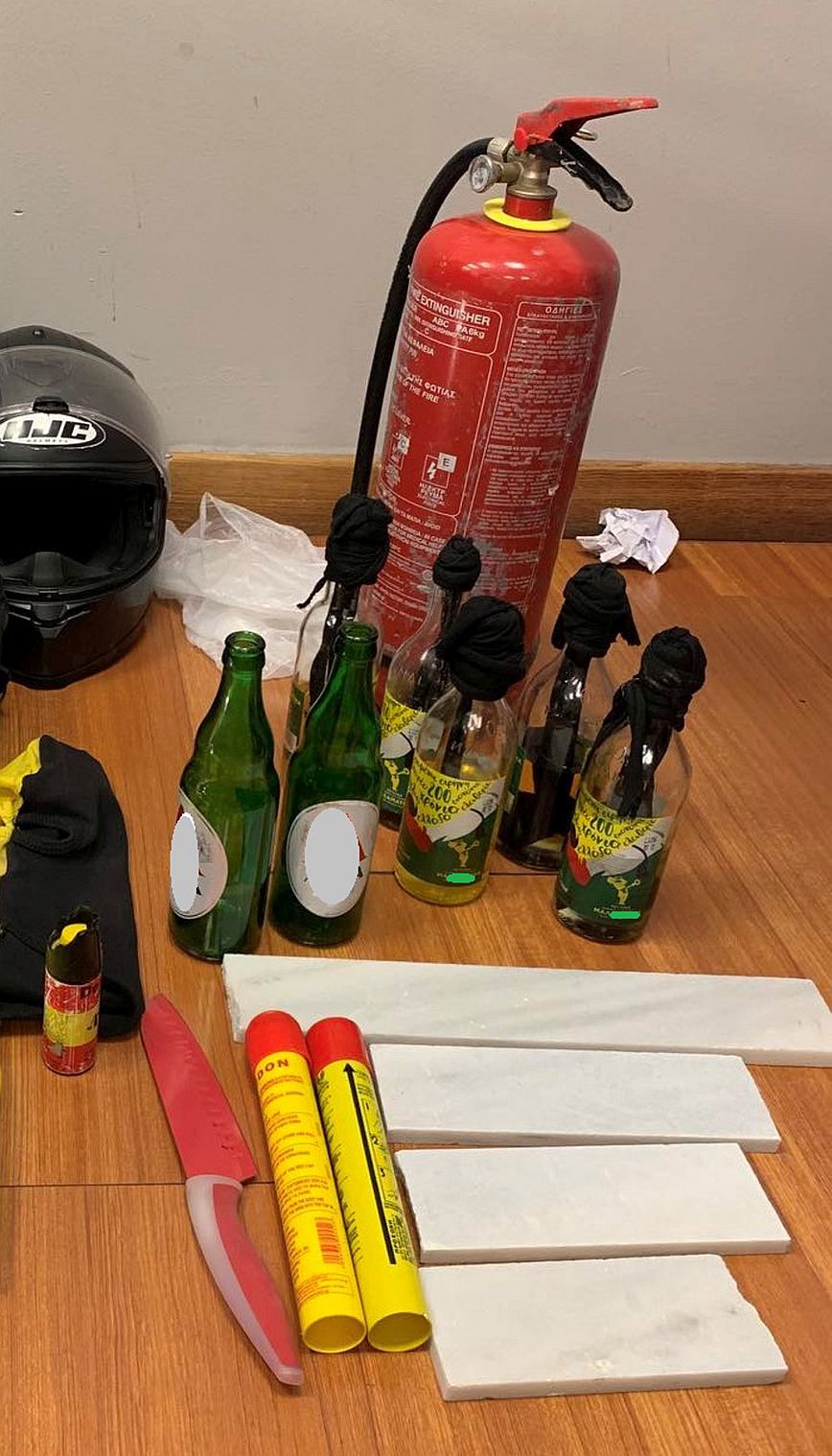 Από τους διενεργηθέντες ελέγχους βρέθηκαν, μεταξύ άλλων και κατασχέθηκαν: 6 μολότοφ, 11 τσεκούρια, 8 σουγιάδες, 5 μαχαίρια, 7 σιδερένιοι σωλήνες, 6 στειλιάρια, 3 καδρόνια, 3 κλομπ, 5 κατσαβίδια, 2 σφυριά, 2 αλυσίδες, σκύλα, κόφτης, 5 πυροσβεστήρες, 33 φωτοβολίδες, 3 κροτίδες, 3 βεγγαλικά, 40 κράνη, 5 κουκούλες full face, πέτρες, μάρμαρα, ποσότητα κοκαΐνης βάρους 2 γραμμαρίων και τσιγάρο με κάνναβη.