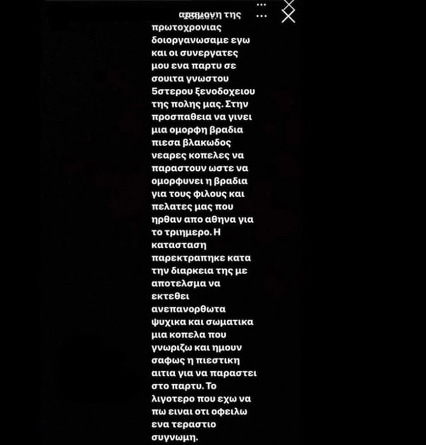 «Η κατάσταση παρεκτράπηκε κατά τη διάρκειά της νύχτας με αποτέλεσμα να εκτεθεί ανεπανόρθωτα ψυχικά και σωματικά μια κοπέλα που γνωρίζω και ήμουν σαφώς η πιεστική αιτία για να παραστεί στο πάρτι. Το λιγότερο που έχω να πω είναι ότι οφείλω ένα τεράστιο συγγνώμη», είχε γράψει ο διοργανωτής του πάρτι στο Instagram.
