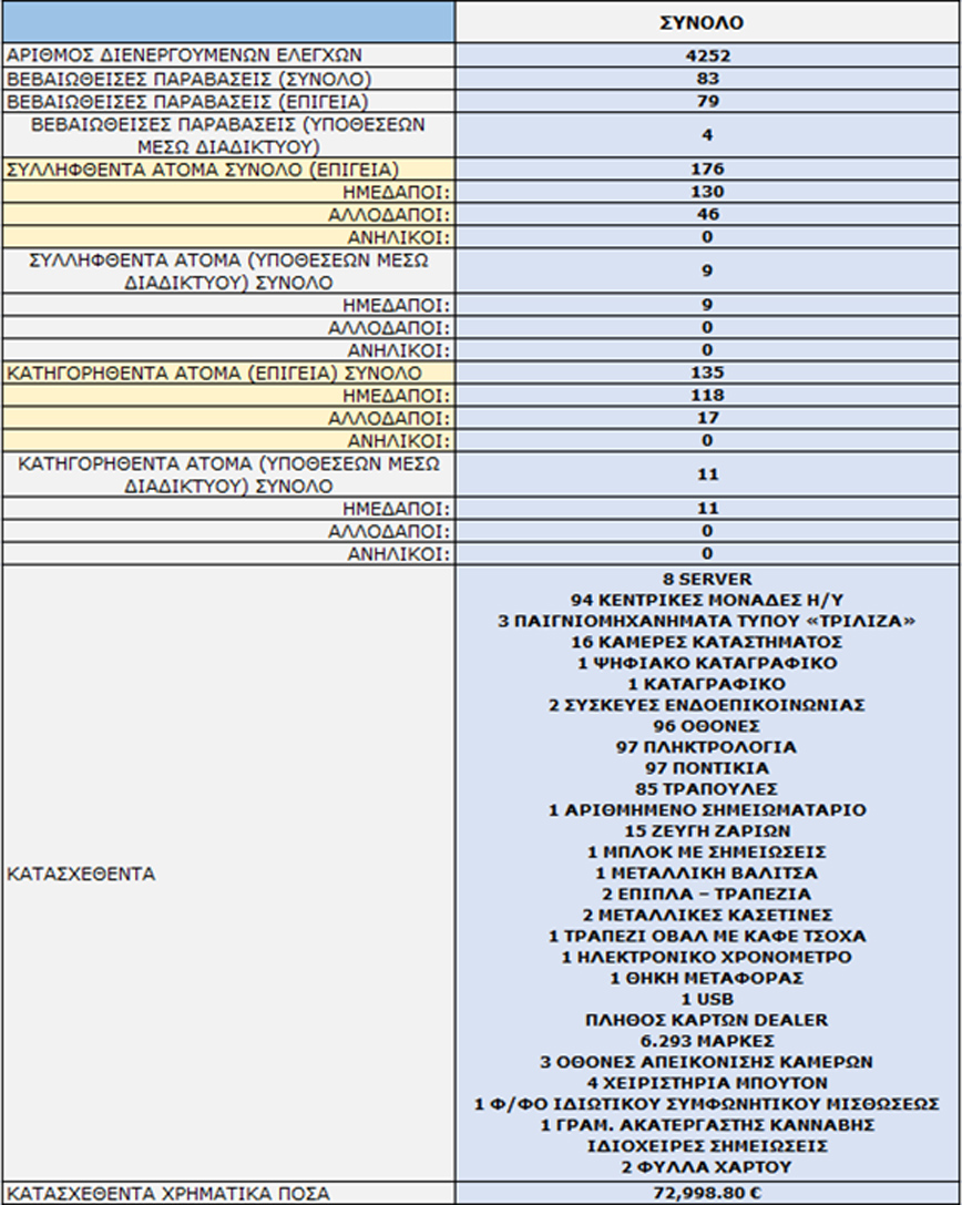 Σύμφωνα με στοιχεία που περιλαμβάνονται σε σχετική ανακοίνωση της ΕΛ.ΑΣ., από τις 83 παραβάσεις, οι 79 αφορούν σε παράνομα μίνι καζίνο, ενώ οι 4 σχετίζονται με παράνομα παίγνια μέσω διαδικτύου.