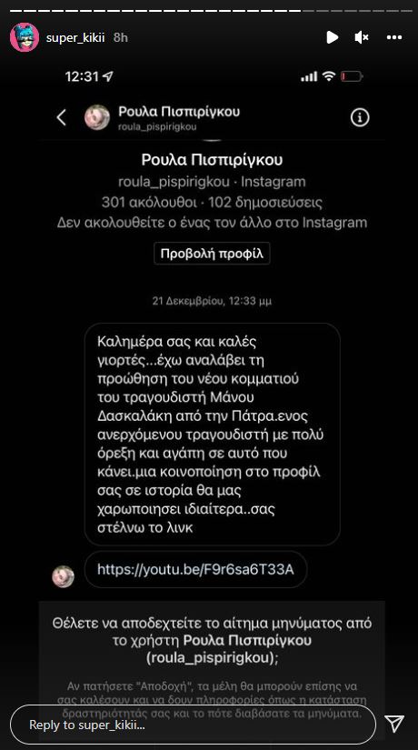Ολοένα και περισσότερα δεδομένα έρχονται στο φως της δημοσιότητας για τη Ρούλα Πισπιρίγκου. Συγκεκριμένα, η γνωστή influencer, Super Κική, μέσα από ένα story στον λογαριασμό της στο Instagram αποκάλυψε ότι η 33χρονη της είχε στείλει μήνυμα για να της ζητήσει να βοηθήσει στην προώθηση ενός τραγουδιού του συζύγου της, Μάνου Δασκαλάκη.