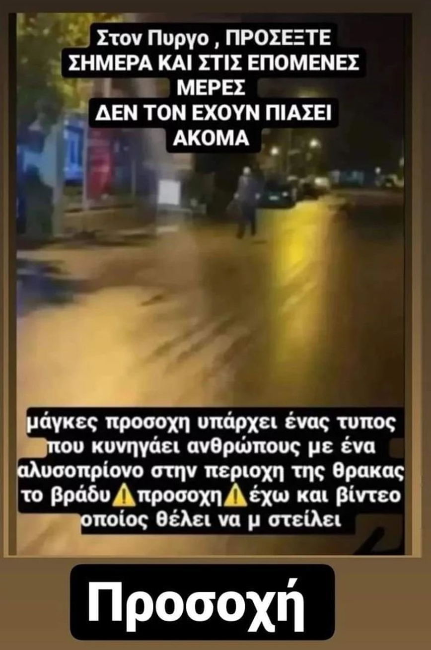 Συναγερμός σήμανε στις Αστυνομικές Αρχές του Πύργου για τον εντοπισμό ενός άνδρα που, σύμφωνα με καταγγελίες, κυκλοφορεί τις νύχτες (2 με 5 τα ξημερώματα) και κυνηγά πολίτες κρατώντας ένα πριόνι και ένα ξύλινο ρόπαλο. Σε άλλες αναφορές γίνεται λόγος ακόμα και για τσεκούρι.