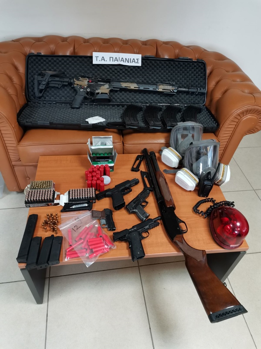 Οι αστυνομικοί εντόπισαν ένα πιστόλι με 3 γεμιστήρες, άλλα 2 αεροβόλα πιστόλια με 3 γεμιστήρες, ένα πιστόλι φωτοβολίδων, δύο κυνηγετικά όπλα, 72 φυσίγγια και 100 αβολίδωτα φυσίγγια πυροβόλου όπλου, 45 φυσίγγια κυνηγετικού όπλου, 12 φυσίγγια καουτσούκ, 12 καψύλλια πυροδότησης πιστολιού φωτοβολίδων, 5 γεμιστήρες, ένας φορητός ασύρματος, ένας κόκκινος φάρος κ.ά. αντικείμενα.