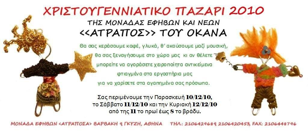 Μέσα στην κρίση των καιρών οι τρεις μάγοι αποφάσισαν άραγε να πάρουν το δρόμο για τη Βηθλεέμ; Φάνηκε στον ουρανό το αστέρι που θα τους φώτιζε το μονοπάτι; Λοιπόν σε πείσμα της κρίσης που διανύουμε εμείς αποφασίσαμε και φέτος να διοργανώσουμε το Χριστουγεννιάτικο παζάρι μας για πέμπτη συνεχή χρονιά. Πόσω μάλλον που τώρα που τα θεσμικά οικονομικά περιθώρια στενεύουν την αγορά ενός δώρου μπορεί να «δωρίσει» στα μέλη του Προγράμματός μας τη δυνατότητα να συνεχίσουν να κάνουν καλλιτεχνικά μαθήματα ή δραστηριότητες στα εργαστήριά μας (μουσική, φωτογραφία, ζωγραφική, κατασκευές κ.α) ή την ευκαιρία να πάρουν υποτροφία για κάποιο Ιδιωτικό Εκπαιδευτικό Ίδρυμα καθώς τα κονδύλια για τα παραπάνω καλύπτονται από το Σύλλογο Γονέων και Κηδεμόνων της «ΑΤΡΑΠΟΥ» που διαχειρίζεται τα έσοδα του BAZAAR.