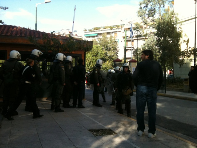 Ήδη, όπως βλέπετε και στη φωτογραφία, ένα τουλάχιστον άτομο τραυματίστηκε στο κεφάλι από κλομπ αστυνομικών, ενώ γίνονται συμπλοκές σώμα με σώμα μεταξύ διαδηλωτών και ΜΑΤ. Πρόκειται για έναν τριτοετή φοιτητή ιατρικής, ο οποίος βρισκόταν στα δικαστήρια μαζί με συμφοιτητές του, κατόπιν απόφασης του ΣΦΙΑ (Συλλόγου Φοιτητών Ιατρικής Αθήνας) για παράσταση διαμαρτυρίας στην προσαγωγή συμφοιτητή του από τα χθεσινά επεισόδια, την προηγούμενη μέρα. Ο φοιτητής δεν συνδέεται με τους υποστηρικτές των έξι.