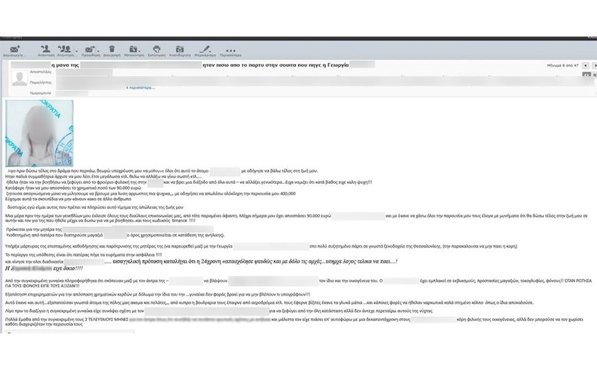 Όπως αναφέρεται στο mail, «η (σ.σ. γυναικείο ονοματεπώνυμο) μάνα της δεκαεπτάχρονης (σ.σ. γυναικείο ονοματεπώνυμο) ήταν πίσω από το πάρτυ στην σουίτα που πήγε η Γεωργία Μπίκα».