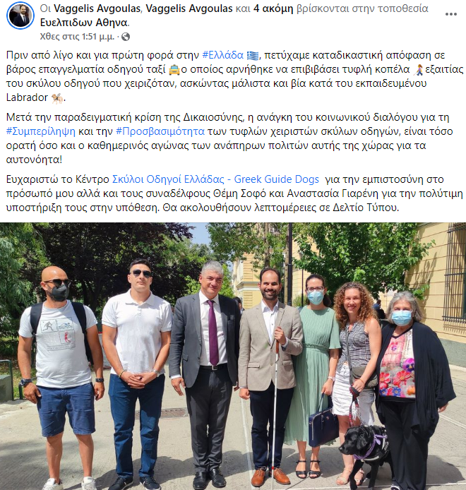 Ευχαριστώ το Κέντρο Σκύλοι Οδηγοί Ελλάδας – Greek Guide Dogs για την εμπιστοσύνη στο πρόσωπό μου αλλά και τους συναδέλφους Θέμη Σοφό και Αναστασία Γιαρένη για την πολύτιμη υποστήριξη τους στην υπόθεση», αναφέρει στην ανάρτησή του ο δικηγόρος.