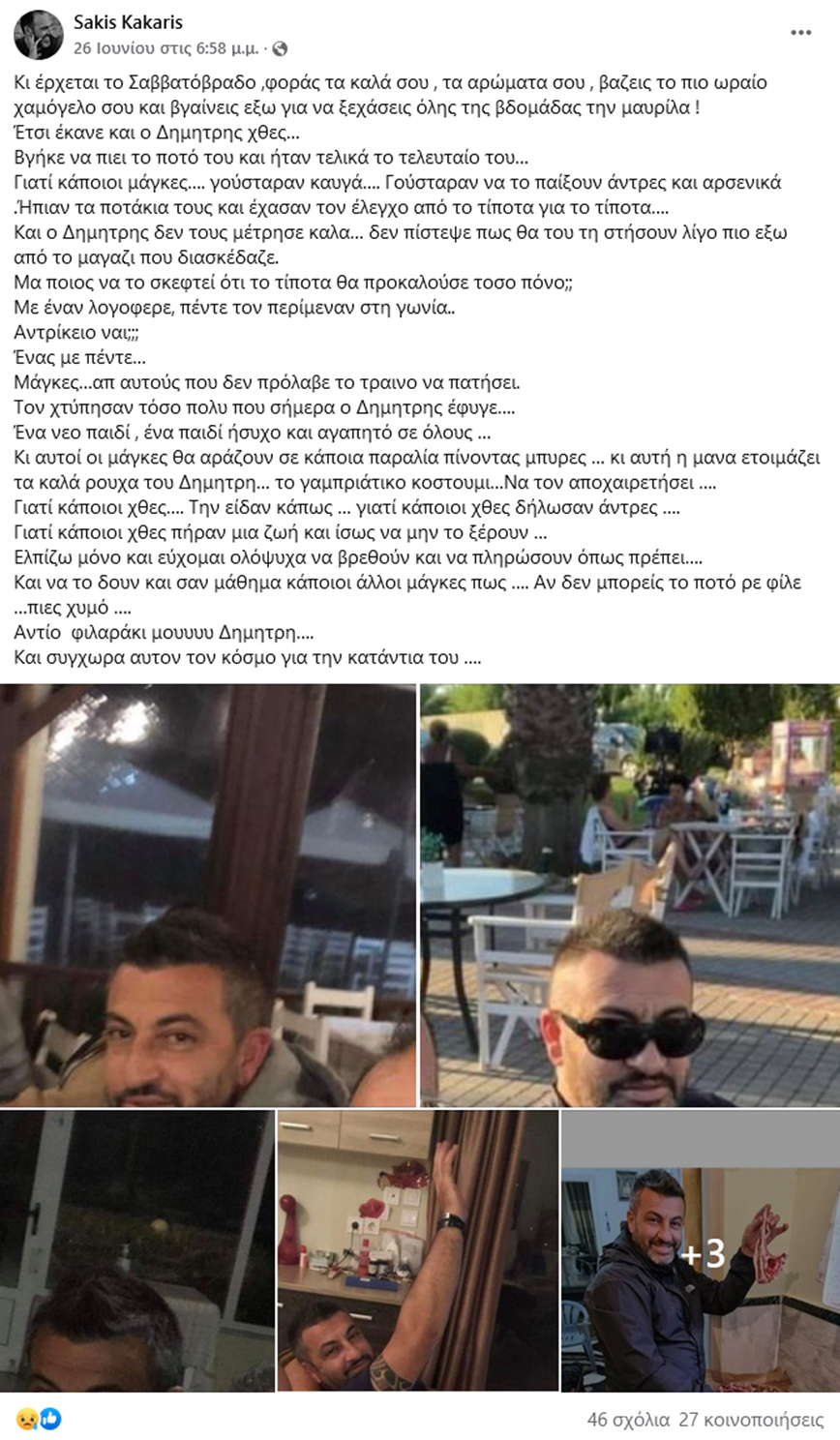 Μια ανάρτηση που συγκινεί δημοσίευσε στο Facebook ο φίλος του 42χρονου που σκότωσαν στο ξύλο σε μπαρ στη Ραφήνα. Η κηδεία του 42χρονου θα γίνει αύριο Τετάρτη 29/6.