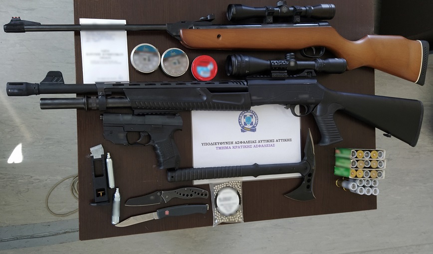 Οι αστυνομικοί της Υποδιεύθυνσης Ασφάλειας Δυτικής Αττικής ταυτοποίησαν ότι ο 35χρονος ήταν ο εικονιζόμενος στο βίντεο και μετά από επιχείρηση του πέρασαν χειροπέδες, ενώ σε έρευνα που πραγματοποιήθηκε στην οικία του, βρέθηκαν και κατασχέθηκαν: καραμπίνα, με ενσωματωμένη διόπτρα σκόπευσης, 5 φυσίγγια, αεροβόλο τυφέκιο όπλο, με ενσωματωμένη διόπτρα σκόπευσης, αεροβόλο πιστόλι, με γεμιστήρα κι ενσωματωμένο λέιζερ στόχευσης, 900 μεταλλικά φυσίγγια αεροβόλου όπλου, 17 φυσίγγια κυνηγετικού όπλου, 250 μεταλλικά σφαιρίδια αεροβόλου όπλου, στιλέτο-σουγιάς και ελβετικός σουγιάς, τσεκούρι, καθώς και 2 αμπούλες αεροβόλου όπλου.
