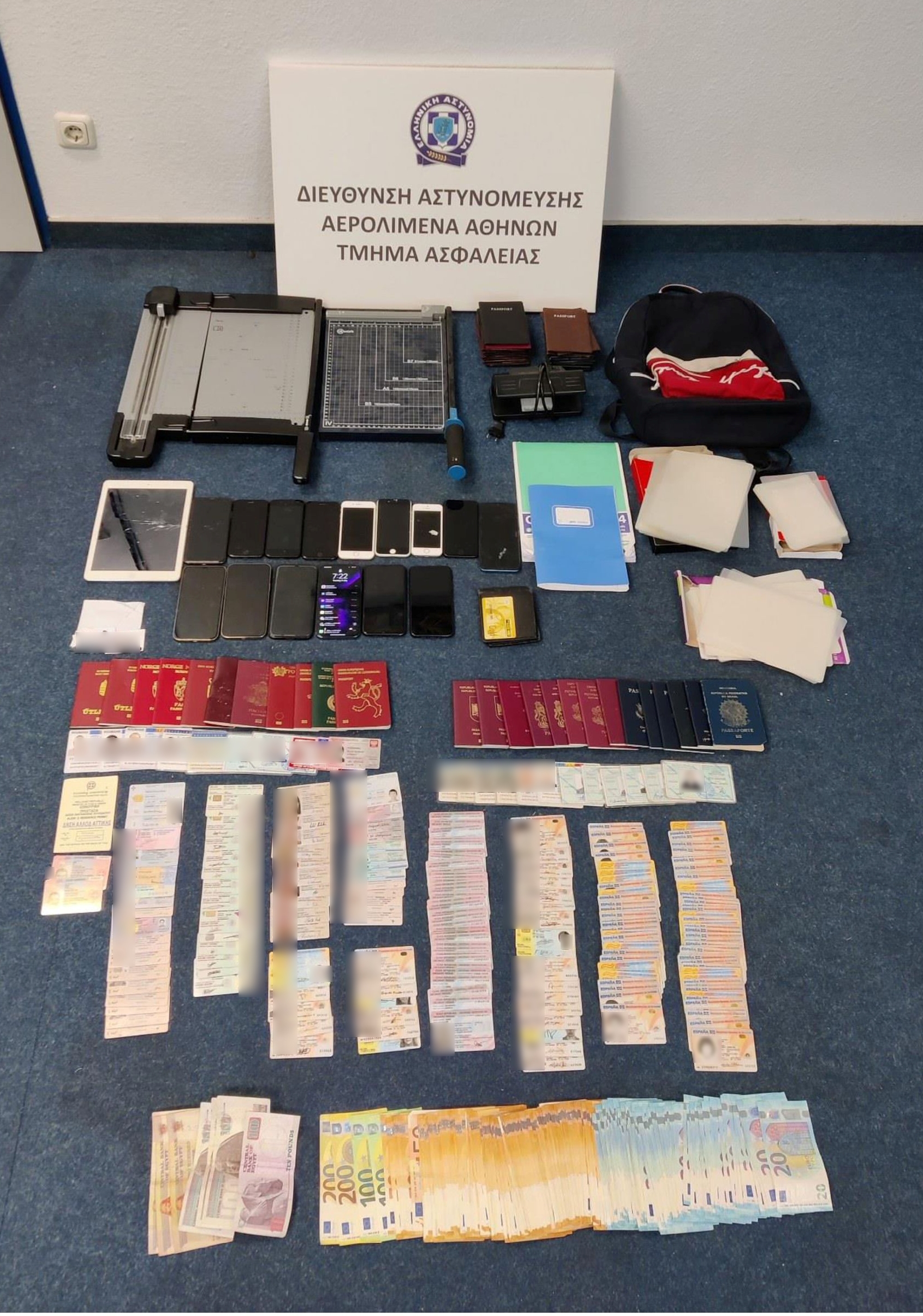 Η αστυνομική επιχείρηση έγινε τη Δευτέρα (4/7) και συνελήφθησαν συνολικά 7 Αιγύπτιοι. Σε έρευνες που διενεργήθηκαν στις οικίες των συλληφθέντων και σε ένα κατάστημα που χρησιμοποιούσαν, βρέθηκαν και κατασχέθηκαν: 244 ταξιδιωτικά έγγραφα διαφόρων χωρών εκ των οποίων τα 22 πλαστά και τα 222 γνήσια, φορητός Η/Υ, 15 κινητά τηλέφωνα, το χρηματικό ποσό των 8.790 ευρώ, το χρηματικό ποσό των 910 λιρών Αιγύπτου, 9 φωτογραφίες τύπου διαβατηρίου, 2 τετράδια σημειώσεων τα οποία περιλαμβάνουν παραγγελίες ταξιδιωτικών εγγράφων κ.ά.