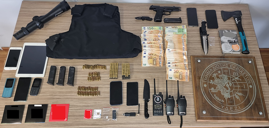 Σε έρευνες που πραγματοποιήθηκαν βρέθηκαν και κατασχέθηκαν στην κατοχή του 42χρονου συλληφθέντα: πιστόλι με υποδοχή για σιγαστήρα και γεμιστήρα με 14 φυσίγγια κα φυσίγγιο στην θαλάμη του, 132 φυσίγγια, 3 γεμιστήρες πιστολιού, 2 μαχαίρια, τσεκούρι, ηλεκτρονική συσκευή παρεμβολής σήματος (gps blocker), ανιχνευτής ηλεκτρονικών συσκευών -κοριών παρακολούθησης, αλεξίσφαιρο γιλέκο, διόπτρα μακρύκανου όπλου, 2 φορητοί ασύρματοι και ένα tablet, 6 κινητά τηλέφωνα, 3 πακέτα τηλεφωνικών συνδέσεων, στέλεχος και κάρτα sim, 2 κάρτες μνήμης, usb stick, όχημα ιδιοκτησίας του, που χρησιμοποιήθηκε για την τέλεση των παραπάνω δράσεων καθώς και το χρηματικό ποσό των 10.750 ευρώ.