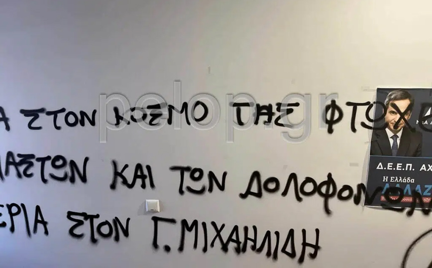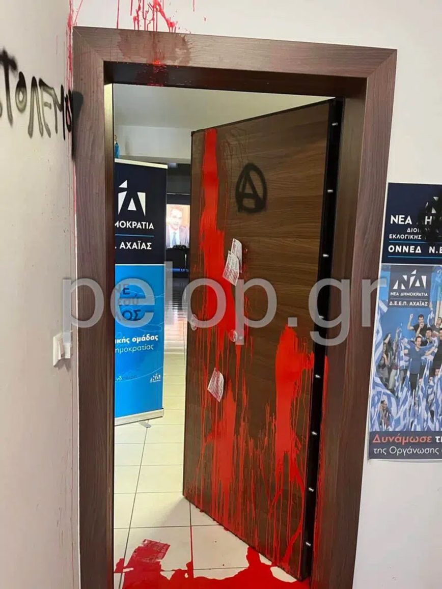 Παρέμβαση στα γραφεία της διοικούσας επιτροπής εκλογικής περιφέρειας Αχαΐας της Νέας Δημοκρατίας, που βρίσκονται στο κέντρο της Πάτρας, πραγματοποίησαν, περίπου στις 12:30 το μεσημέρι, άτομα που πρόσκεινται στον αντιεξουσιαστικό χώρο.