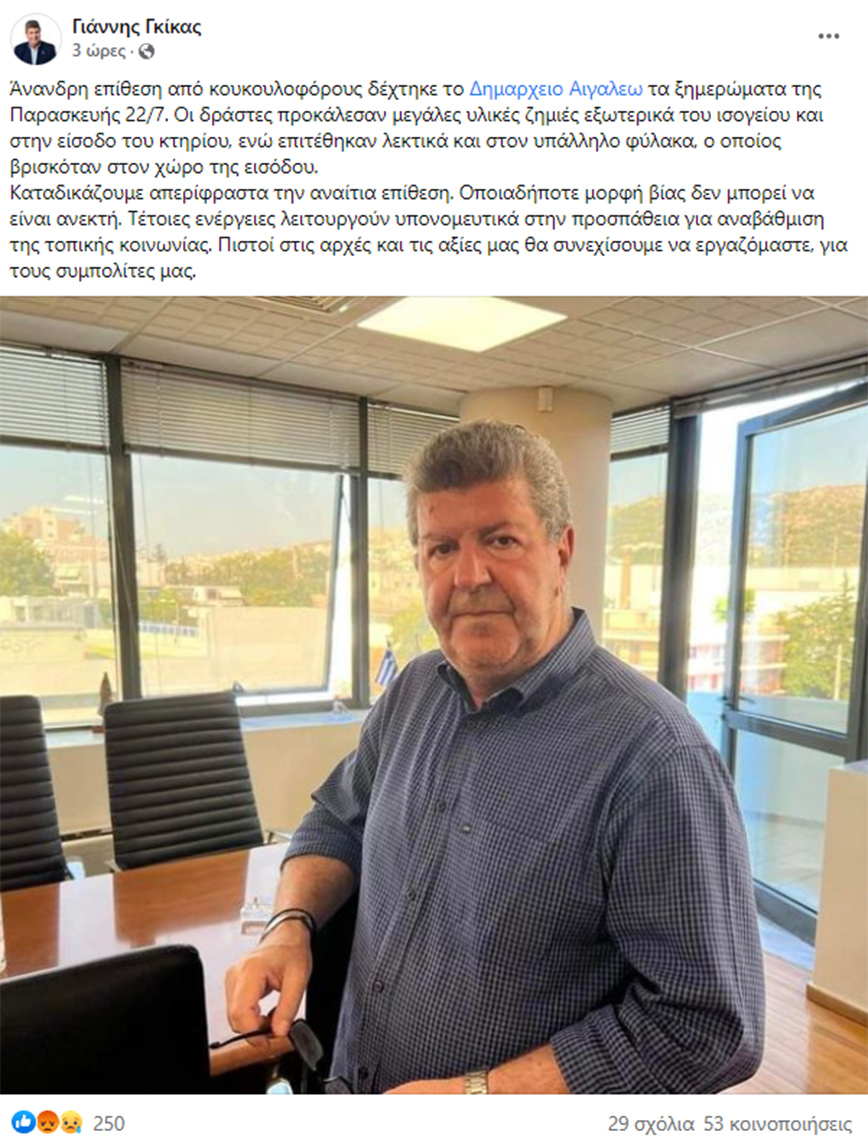 Βαρβιτσιώτης: Καταδικάζω απερίφραστα την επίθεση από κουκουλοφόρους στο δημαρχείο Αιγάλεω