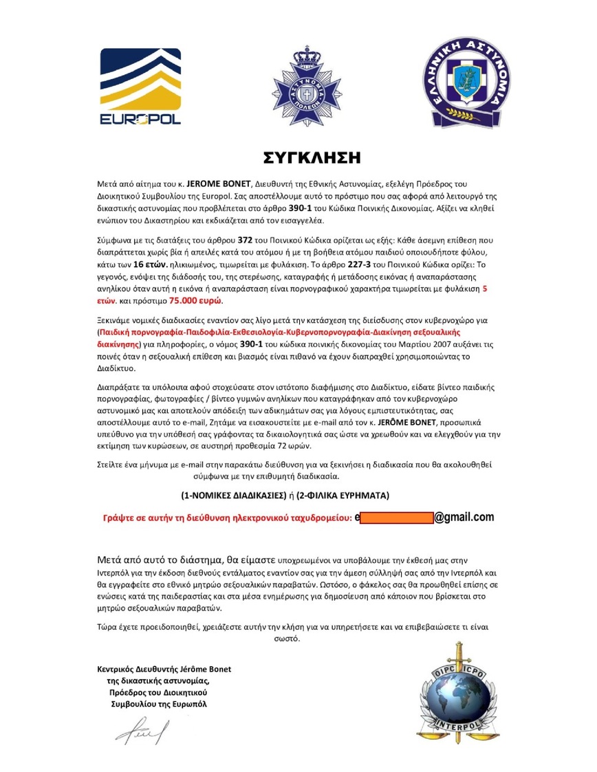Ειδικότερα, οι δράστες, σύμφωνα με την ΕΛ.ΑΣ., σε επιστολή δήθεν αρμόδιων ελεγκτικών αρχών, προσπαθούν να εξαπατήσουν πολίτες – χρήστες του διαδικτύου, με το πρόσχημα ότι ο αποδέκτης τους εμπλέκεται σε υπόθεση πορνογραφίας και άλλων αδικημάτων, επισημαίνοντας μάλιστα ότι τέτοιου είδους αδικήματα επιφέρουν ποινή φυλάκισης 5 ετών και πρόστιμο ύψους 75.000 ευρώ.