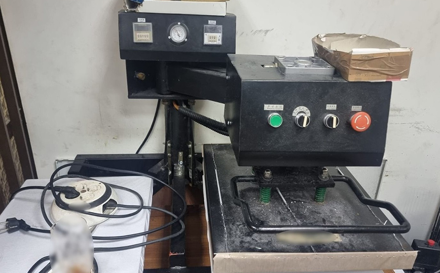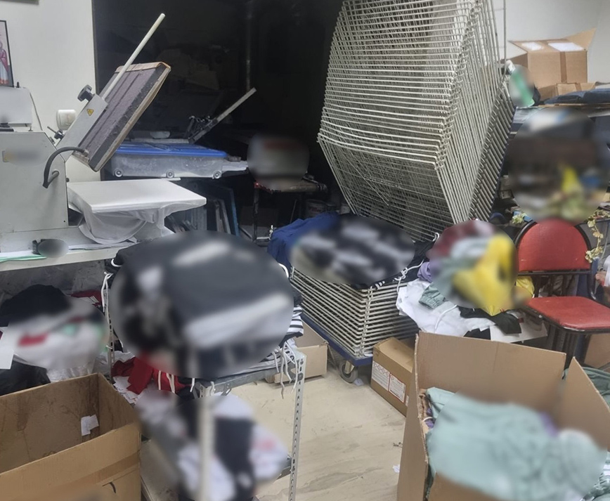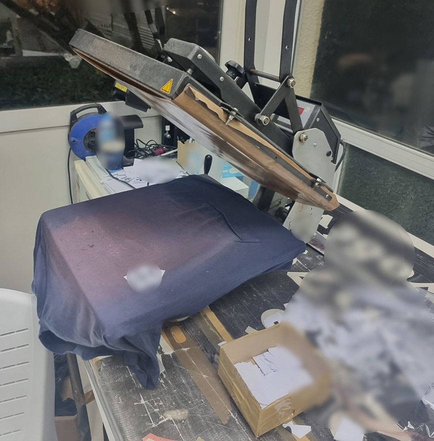 Σε έρευνες που ακολούθησαν στον χώρο του εργαστηρίου, καθώς και στα οχήματα, οι αστυνομικοί βρήκαν, μεταξύ άλλων, 30.000 έτοιμα εντυπώματα σημάτων επώνυμων εταιριών, 2.387 ενδύματα, τα οποία ήταν απομιμητικά προϊόντα επώνυμων εταιριών, 1.368 ενδύματα έτοιμα προς εντύπωση σημάτων, τρεις ηλεκτρικές πρέσες, μία ηλεκτρική συσκευή επιγραφοποιίας κ.ά.