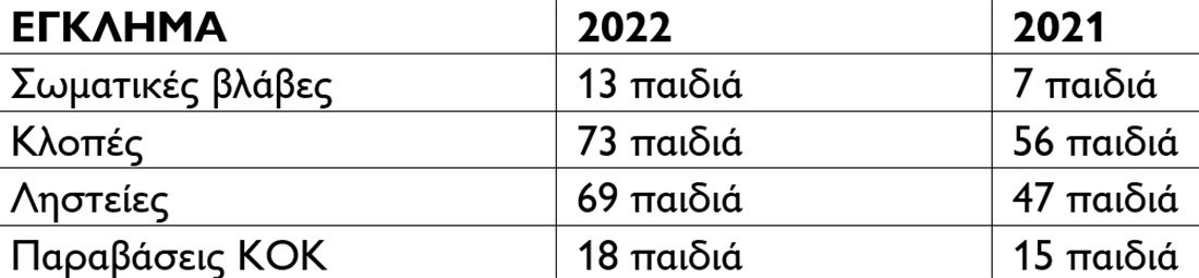 Την ίδια ώρα και πάντα αντιπαραβάλλοντας τα α’ τετράμηνα 2021 με 2022, διαπιστώνεται αύξηση και στα περιστατικά κλοπών που εμπλέκονται παιδιά ηλικίας 8 έως 14 ετών. Πιο αναλυτικά πέρσι οι δικογραφίες αφορούσαν 56 παιδιά δημοτικού και γυμνασίου, ενώ φέτος ο αριθμός αυτός αυξήθηκε σε 73. Ίδια εικόνα και στις υποθέσεις ληστειών, καθώς τα 47 παιδιά ηλικίας 8 έως 14 ετών το διάστημα Ιανουάριος – Απρίλιος 2021, έγιναν 69 το αντίστοιχο διάστημα φέτος. Αν και προκαλεί εύλογες απορίες, το 2021 είχαμε 15 παιδιά αυτής της ηλικίας να εμπλέκονται σε παραβάσεις του ΚΟΚ, με τον αριθμό για φέτος και πάντα για το α’ τετράμηνο να αυξάνει σε 18.