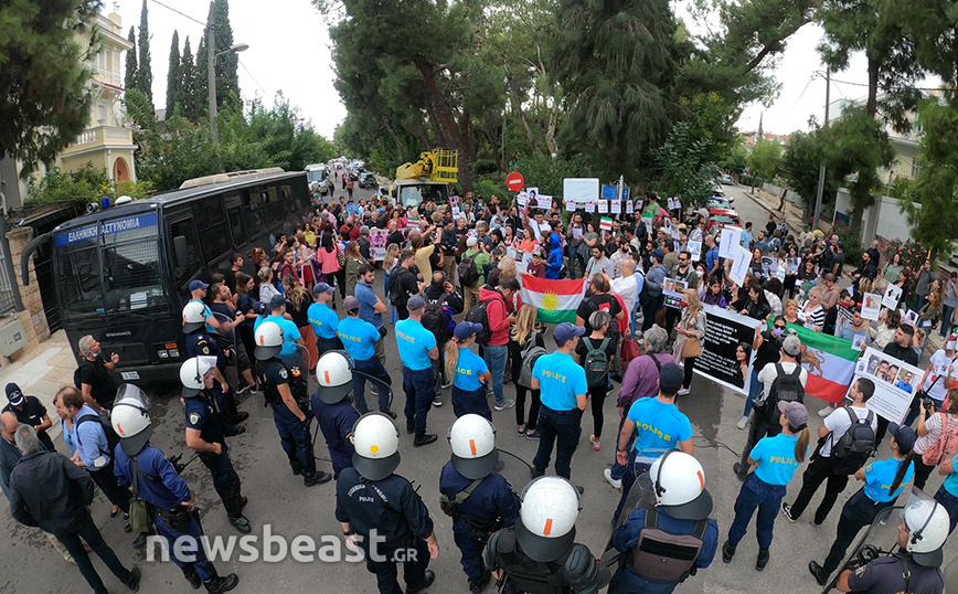Στη συγκέντρωση έξω από την πρεσβεία του Ιράν συμμετέχουν γύρω στα 150 άτομα.