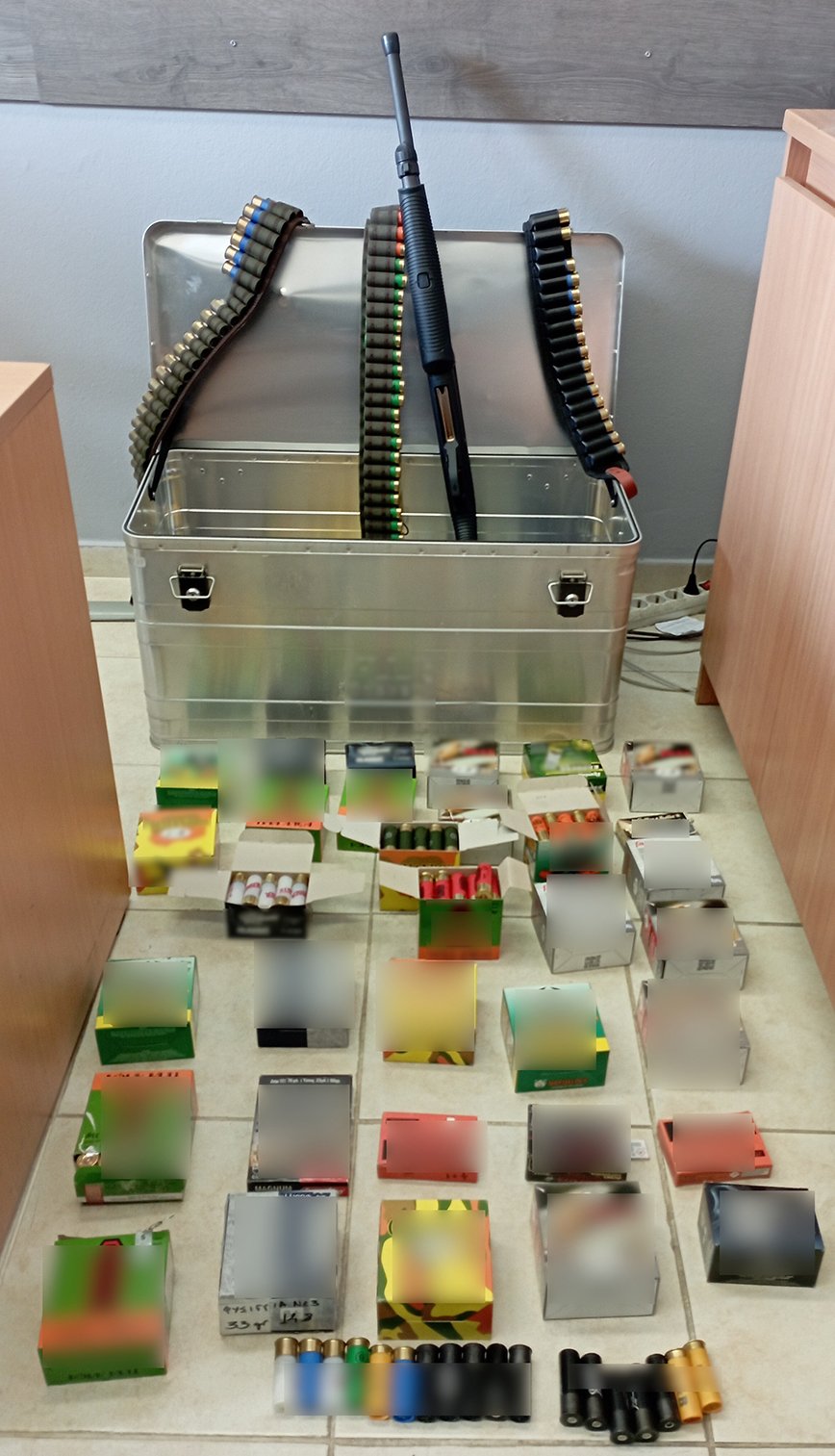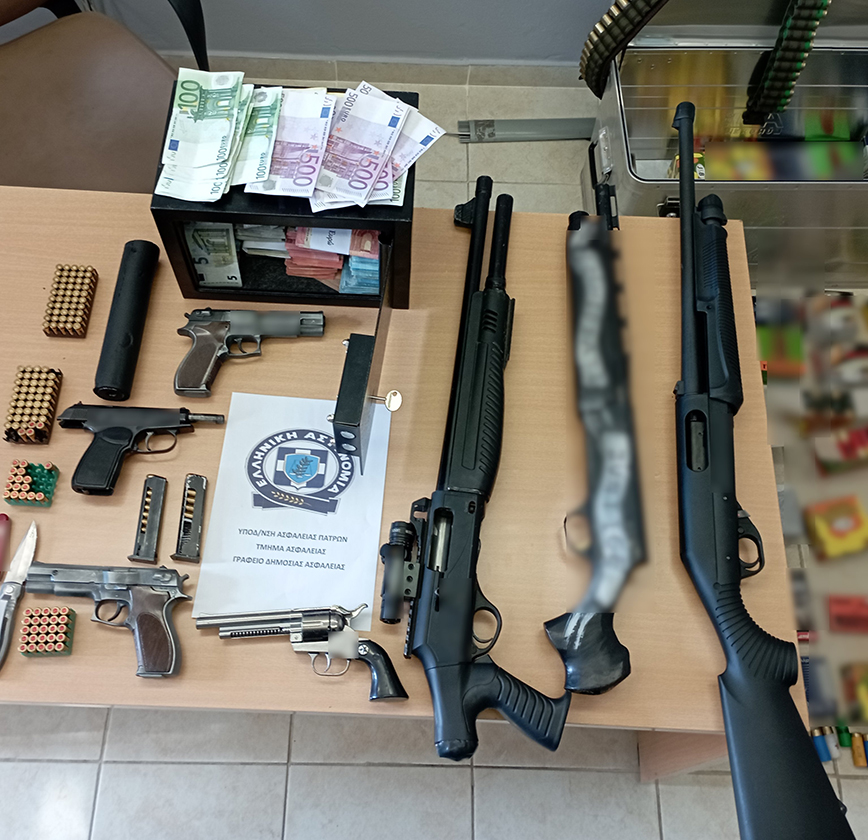 Ειδικότερα, σύμφωνα με την αστυνομία, έπειτα από την αξιοποίηση πληροφοριών που είχαν συγκεντρώσει οι αστυνομικοί της Ασφάλειας Πατρών για την υπόθεση, πραγματοποίησαν έρευνα σε επιχείρηση και αποθήκη σε περιοχή της Αιγιάλειας, όπου βρήκαν δύο τόνους και 79 κιλά λαθραίου καπνού και τσιγάρων διαμοιρασμένων σε περισσότερες από 700 συσκευασίες και 7.748 λαθραία πακέτα τσιγάρων. Επίσης βρήκαν ένα πιστόλι, με γεμιστήρα που περιείχε έξι φυσίγγια των 9mm και γεμιστήρα πιστολιού που περιείχε οκτώ φυσίγγια των 9mm, τρεις καραμπίνες και laser στόχευσης, τρία ομοιώματα πιστολιού και περιστρόφου, ένα σιγαστήρα πυροβόλου όπλου, δύο σουγιάδες και ένα μεταλλικό σπαθί συνολικού μήκους 85 εκατοστών, 136 φυσίγγια των 9mm, 1.191 κυνηγητικά φυσίγγια, δυο πλαστές πινακίδες κυκλοφορίας, και το χρηματικό ποσό των 41.305 ευρώ.