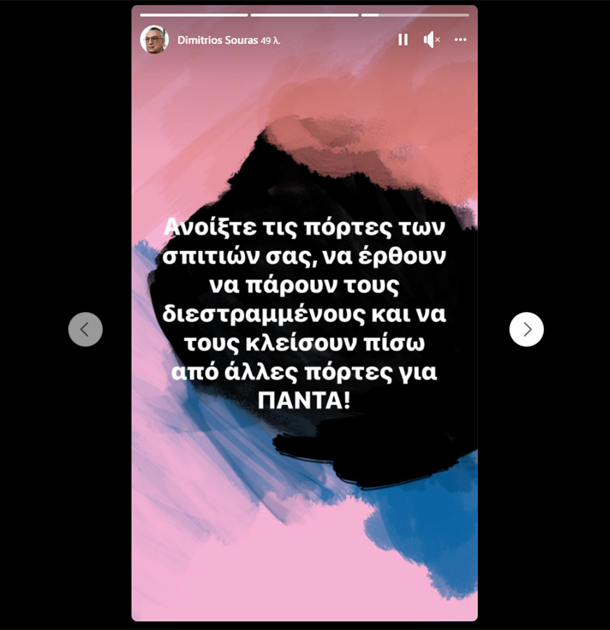 «Ανοίξτε τις πόρτες των σπιτιών σας, να έρθουν να πάρουν τους διεστραμμένους και να τους κλείσουν πίσω από άλλες πόρτες για ΠΑΝΤΑ» σχολιάζει τέλος ο Δημήτρης Σούρας.