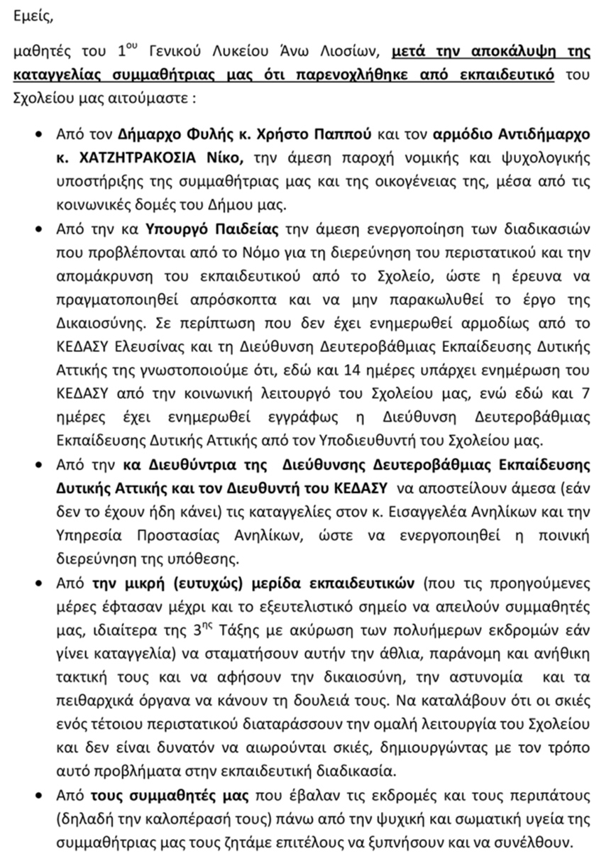 Ανάστατη είναι η τοπική κοινωνία των Άνω Λιοσίων μετά από ανακοίνωση μαθητών, σύμφωνα με την οποία μαθήτρια από το 1ο ΓΕΛ Άνω Λιοσίων παρενοχλήθηκε από καθηγητή του σχολείου. Όπως αναφέρουν οι συμμαθήτριες της, η 16χρονη είχε μιλήσει σε καθηγητές της πριν από δυο μήνες.
