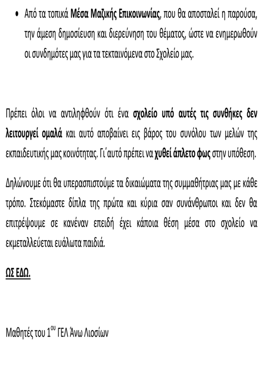 Τα παιδιά ζητούν την κίνηση των διαδικασιών για να διαλευκανθεί η υπόθεση, επικαλούμενα τόσο την βοήθεια της Υπουργού Παιδείας, όσο και της Διευθύντριας Διεύθυνσης Δευτεροβάθμιας εκπαίδευσης Δυτικής Αττικής, της διοίκηση του Δήμου, αλλά και των τοπικών μέσων.